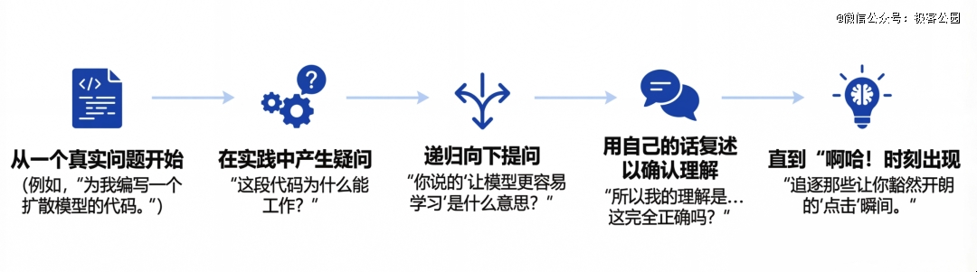 我觉得 Gabriel 的方法论可以抽象成一个更通用的五步框架,每个人都可以通过 AI 学习任何不懂的领域。