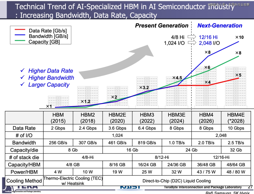 最近,韩国KAIST大学TERALAB实验室(韩国科学技术院tera字节互联与封装实验室)发布了一份371页的《HBM Roadmap Ver 1.7》,这份报告堪称HBM领域的“圣经”——不仅详细拆解了当前HBM3/3E的技术细节,更画出了从2026年HBM4到2038年HBM8的完整发展蓝图。报告里的每一个参数、每一张架构图都在告诉我们:未来10年,AI能跑多快、算多准,很大程度上要看HBM能“送”多快。