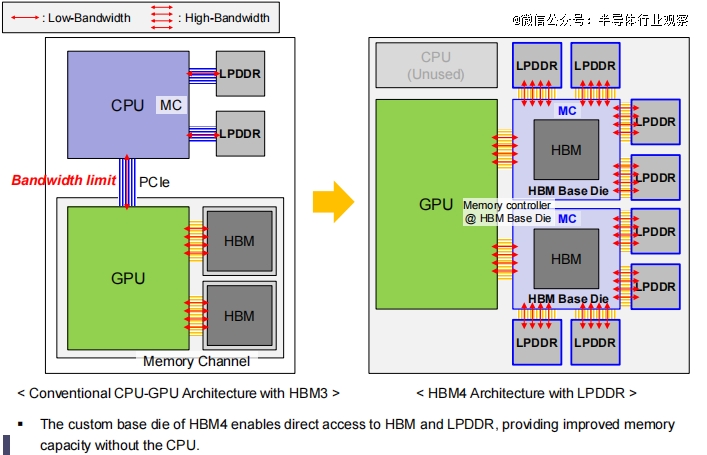 早年的HBM是“一刀切”的——不管你是做AI训练还是游戏显卡,Base Die的设计都一样。但HBM4的Base Die能“按需改造”,最实用的功能就是“直接连接LPDDR”: