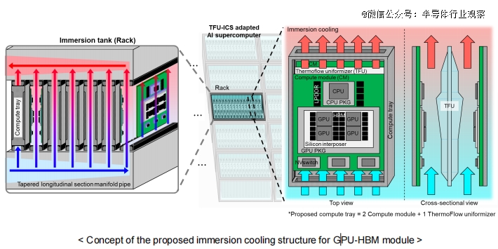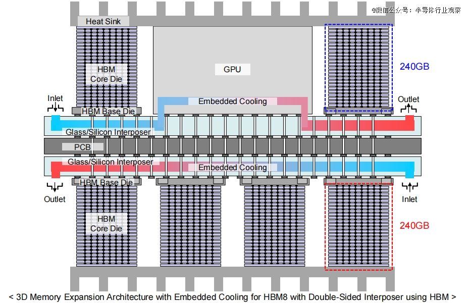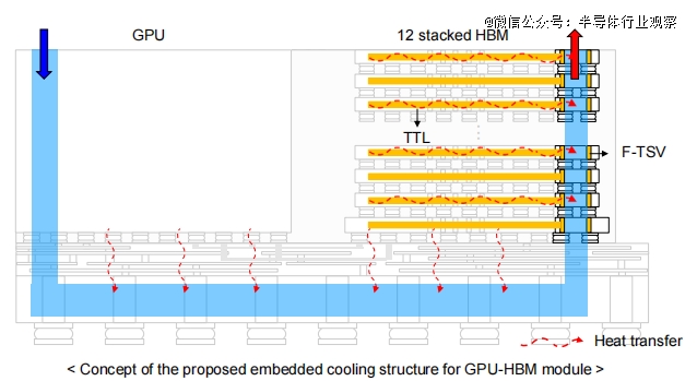 160W的功率,传统的浸没式冷却以应对集中化的高热量,无法满足稳定运行需求,HBM7采用“嵌入式冷却”——在Base Die和Core Die里直接刻出“微型水道”(直径50微米,比头发丝还细),让冷却液直接在芯片内部循环,热量能快速被带走(热传输线(TTL)和流体热沉(F-TSV)可以通过将冷却液从GPU循环到中介层和HBM,从而高效地冷却HBM模块。TTL可将HBM芯片内部的热量传递给流经F-TSV的流体)。