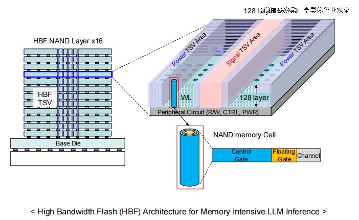 HBM7最关键的升级是“集成HBF(High Bandwidth Flash,高带宽闪存)”——HBF是128层的NAND闪存,相当于“大容量仓库”,单模块容量2TB(是HBM的10倍以上),每GB成本只有HBM的1/5。