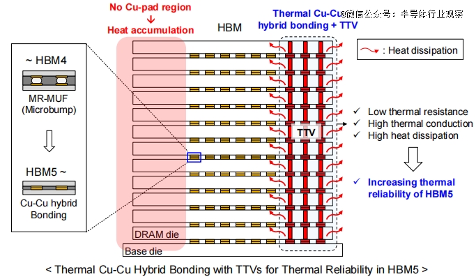 早期HBM的芯片之间用“微凸点(Microbump)”连接——就像用“纽扣”把两片衣服扣在一起,中间有间隙,电阻高,还容易松动;而混合键合(Cu-Cu Bonding,铜-铜直接键合)就是“把两片芯片的铜层直接焊在一起”,没有间隙,电阻低,还特别牢固。