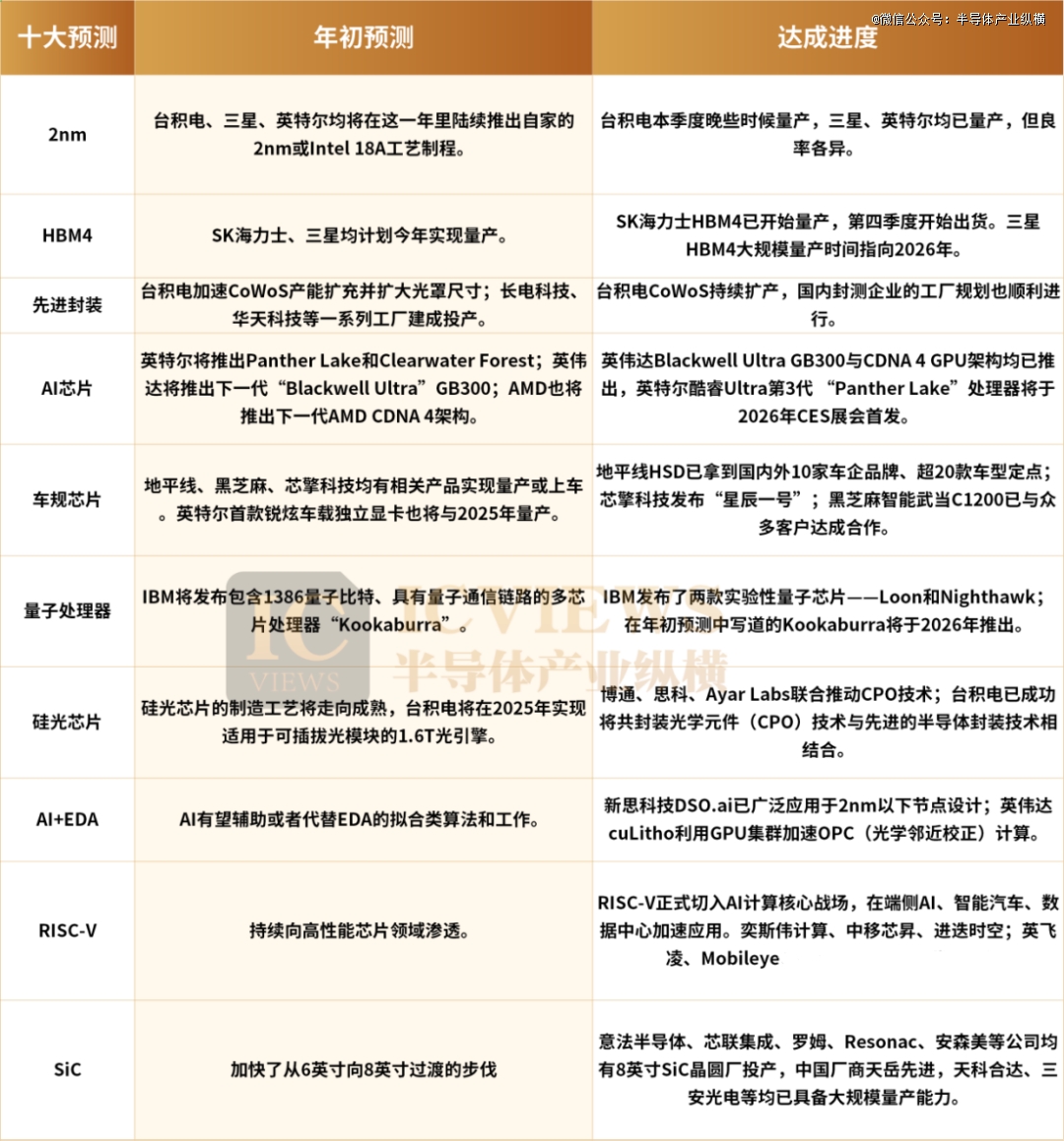 2025年进入尾声,年初刷屏的“半导体十大技术趋势预测”也到了交答卷的时刻。2nm、HBM4、先进封装、AI 处理器、智驾芯片、量子处理器等核心方向,始终是行业关注重点。这一年来,这些预测的 “进度条” 究竟走了多少?今天一起顺着时间线,拆解十大方向的真实进展。