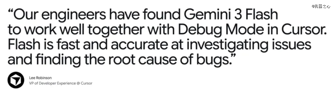 Cursor 开发者体验副总裁表示,他们的工程师发现,Gemini 3 Flash 与 Cursor 的 Debug Mode 配合使用效果非常出色。该模型在问题排查和定位 Bug 根本原因方面表现出速度快、准确性高的优势。