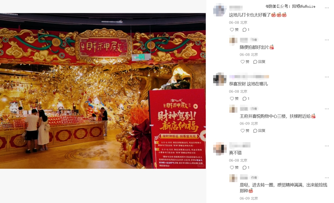 资本也在刻意迎合这一倾向,眼看财神殿香火不断,干脆将其「搬」进商场:弱化信仰成分、强化打卡属性,供消费者随意闲逛和拍照进而出售文创产品,正成为一门新的生意。
