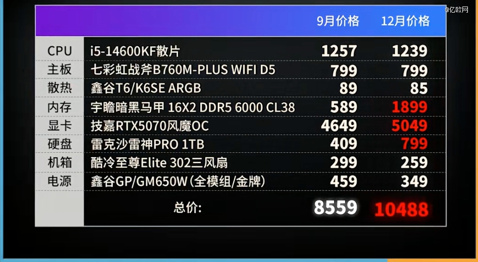 9月一套8550块的攒机方案,2个多月后重新买一下,啥也不变,价格变成了10488。