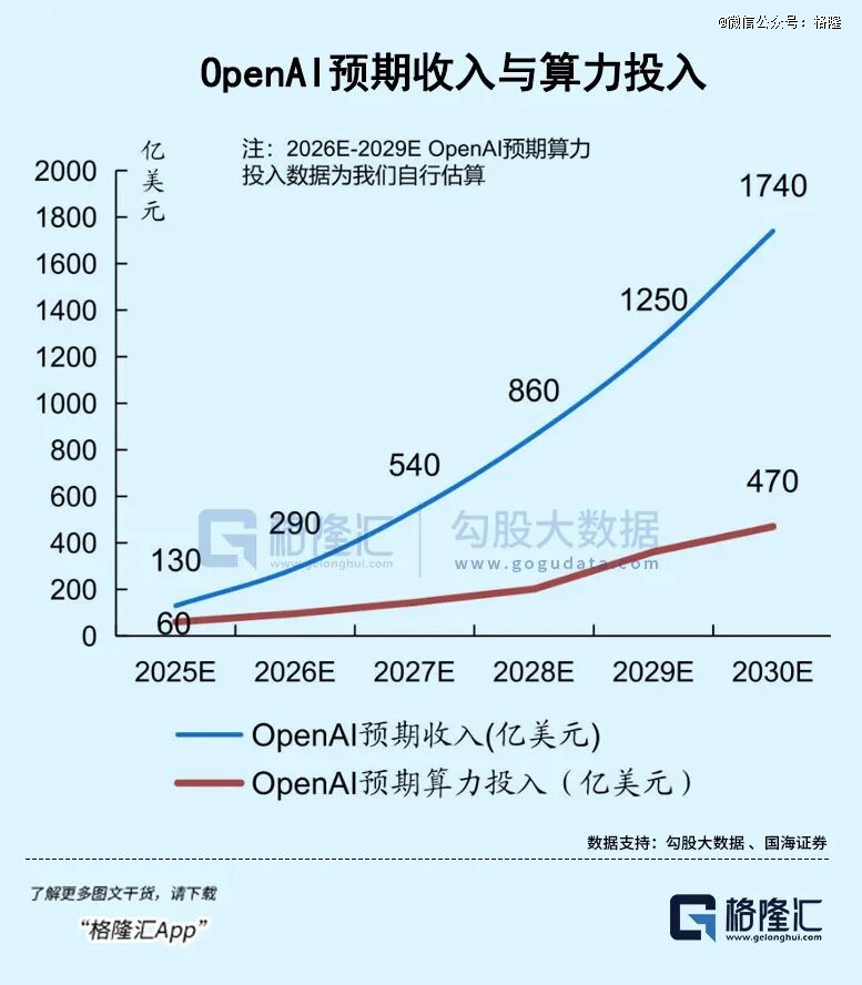 更关键的是算力变现。未来OpenAI可能效仿AWS出租算力,按2030年全球算力需求测算,这块业务能新增500亿美元营收。