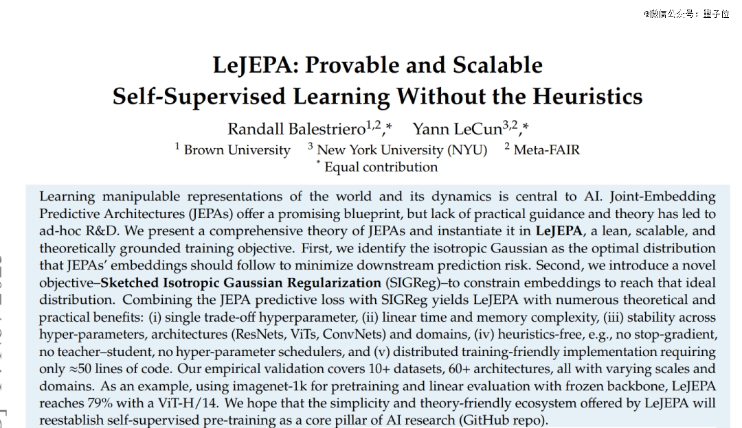 LeJEPA核心提出了一种基于各向同性高斯嵌入的自监督学习方法,通过引入SIGReg正则化,有效解决了表示崩溃问题,并显著提升了模型的泛化能力。