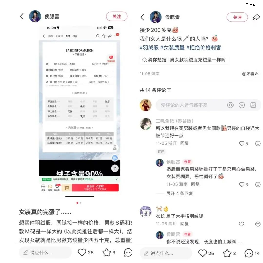 长期以来,许多品牌通过“形象焦虑”的营销话术,合理化了对女性羽绒服的功能阉割,迫使女性消费者在保暖和好看之间做出取舍,以比男装更贵的价格,购入单位体积充绒量远远不足的女装。