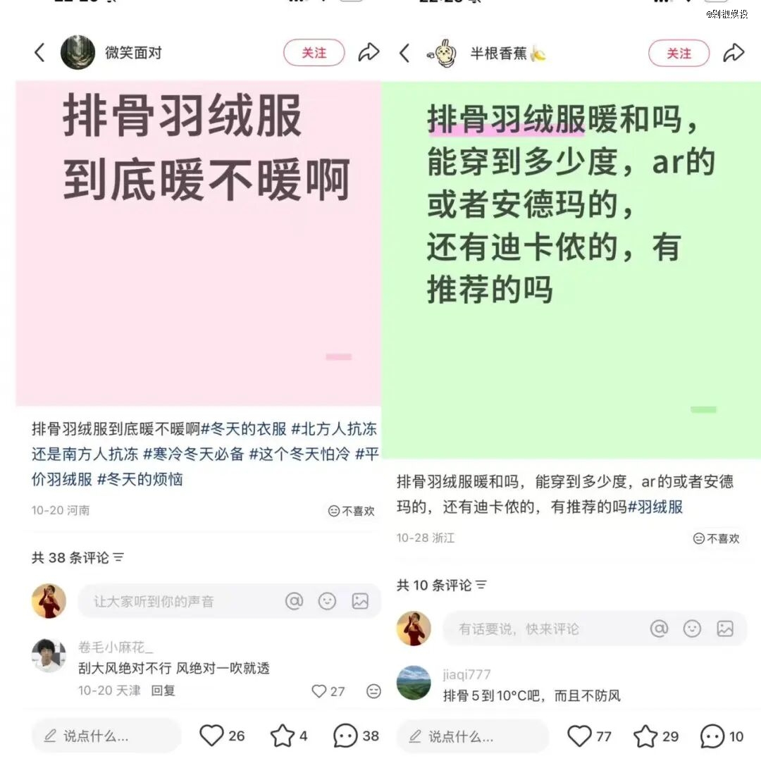 但即便如此,社交媒体上对 “400g 充绒量”的称赞也反映出,在羽绒服这个品类上,“充绒量大”就是会让消费者直观上觉得“更暖,更值得”,从而更愿意买单。这和今年很多品牌主打的轻薄款,在功能预期上存在差异,也警示了羽绒服过度迎合轻薄趋势可能损失核心的功能价值。