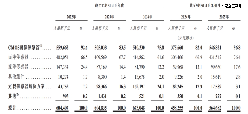2025年1-9月,CMOS图像传感器在总收入当中的占比约96.8%,较2024年的75.8%有所提升;其中,面阵传感器的占比约76.4%,线阵传感器的占比约17.6%。