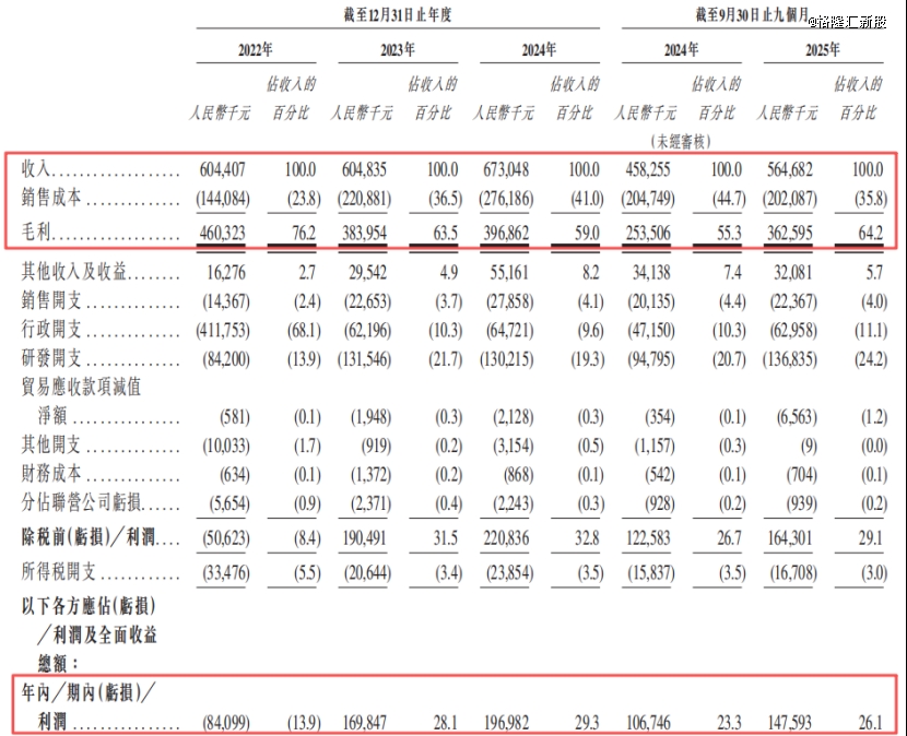 2022年、2023年、2024年及2025年1-9月(报告期),公司的收入分别为6.04亿元、6.05亿元、6.73亿元、5.65亿元,净利润分别为-8410万元、1.7亿元、1.97亿元、1.48亿元。
