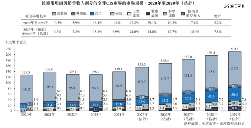按应用明细与销售收入划分的全球CIS市场的市场规模,来源:招股书