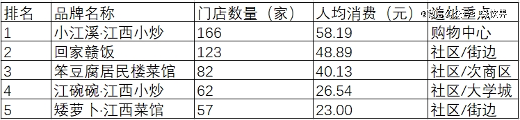 窄门餐眼数据显示,全国范围内已有至少8个连锁品牌的门店数量突破50家,其中TOP5品牌分别为小江溪、回家赣饭、笨豆腐居民楼菜馆、江碗碗、矮萝卜。