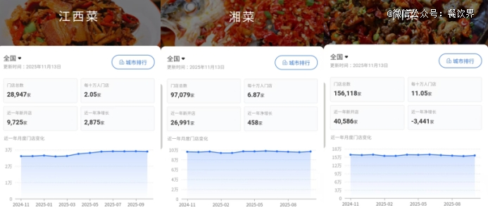 窄门餐眼数据显示,在近一年内(截至2025年11月13日统计周期),江西菜全国新开门店9725家,净增长2875家。这一增长数字,超过湘菜同期的458家。同期的川菜与粤菜两大热门菜纱,更是出现了门店数量的负增长。它标志着,在“下饭”、“锅气”等消费情绪的牵引下,整个江西风味正在突破地域认知的藩篱,从一个餐饮的“细分选项”成长为全国性的“主流选择”。