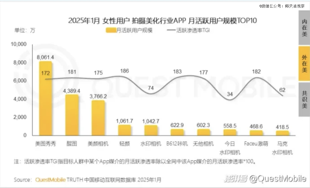 在QuestMobile发布的2025年1月中国互联网女性用户最喜爱App榜单中,美图秀秀在图片美化类应用中表现突出,持续保持领 先地位。