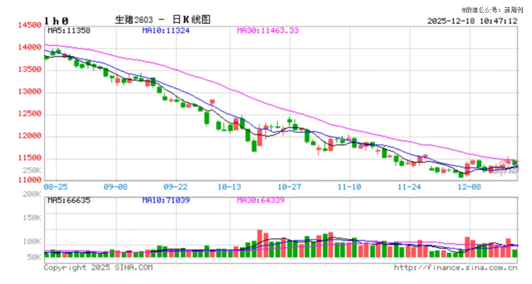与蔬菜形成鲜明对比的是,猪肉价格持续低迷。一斤猪五花肉11元,一斤排骨20元,腿肉一斤8元。农业农村部数据显示,2025年11月最后一周,生猪平均收购价格为13.11元/公斤,环比下降0.9%,同比下降27.0%,到了12月第二周,这个价格已经变成了11.81元/公斤,环比连续5周下跌。