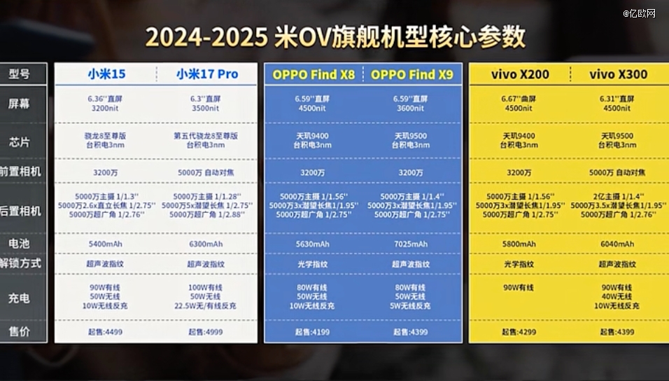 我们列出米OV今年和去年两代旗舰的硬件数据,可以发现在处理器、屏幕、摄像头传感器这些核心硬件方面,这一代的变化都不算大,提升最 大的,似乎只有电池容量。