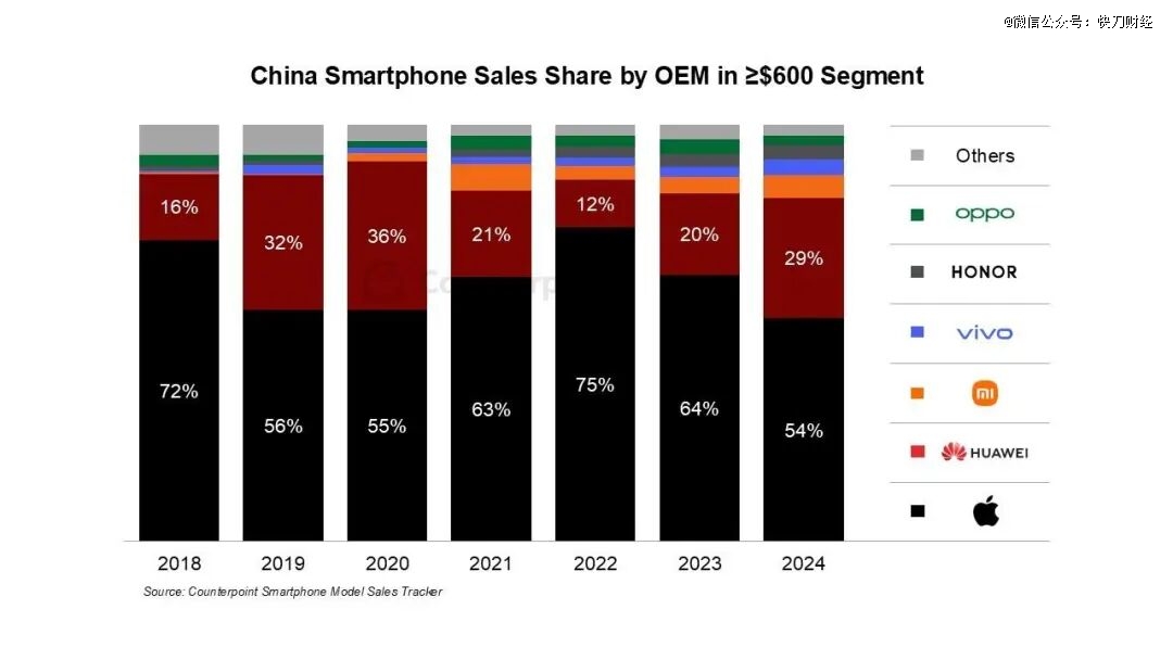 而在高端市场,相比其他很多行业,高端手机是少有至今格局依然未曾变大的赛道。2024年的机构数据表明,4K以上旗舰机中,苹果与华为占据了80%以上份额,预估2025年各厂商份额不会有太多改变。