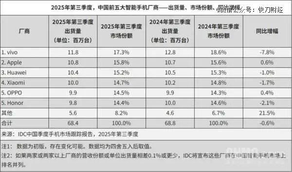 国内手机份额排名中,IDC数据显示vivo、苹果与华为处于前三,业内目前认为行业中国产手机基本形成“华米V”的格局。