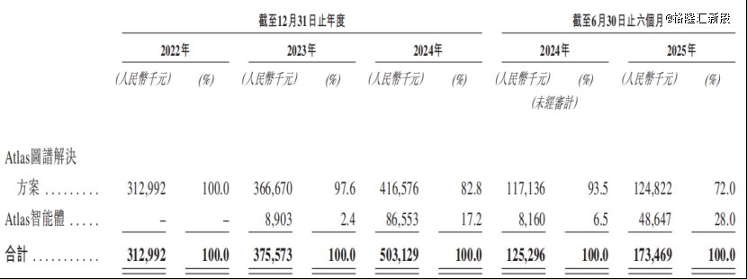 分业务线来看,2022年至2025年上半年,海致科技来自Atlas图谱解决方案的收入占比由100%下降至72%,而来自Atlas智能体的收入由0提升至28%。