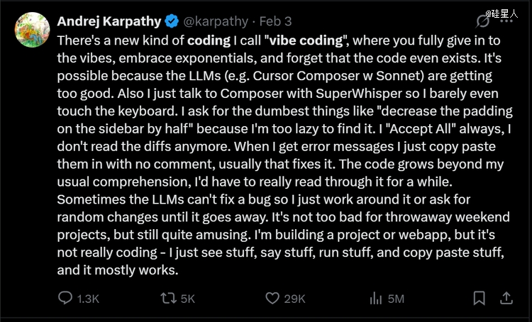 (一)“有一种新的编程方式,我叫它vibe coding。你把自己完全交给感觉,拥抱指数增长,忘记代码本身的存在。”——Andrej Karpahy