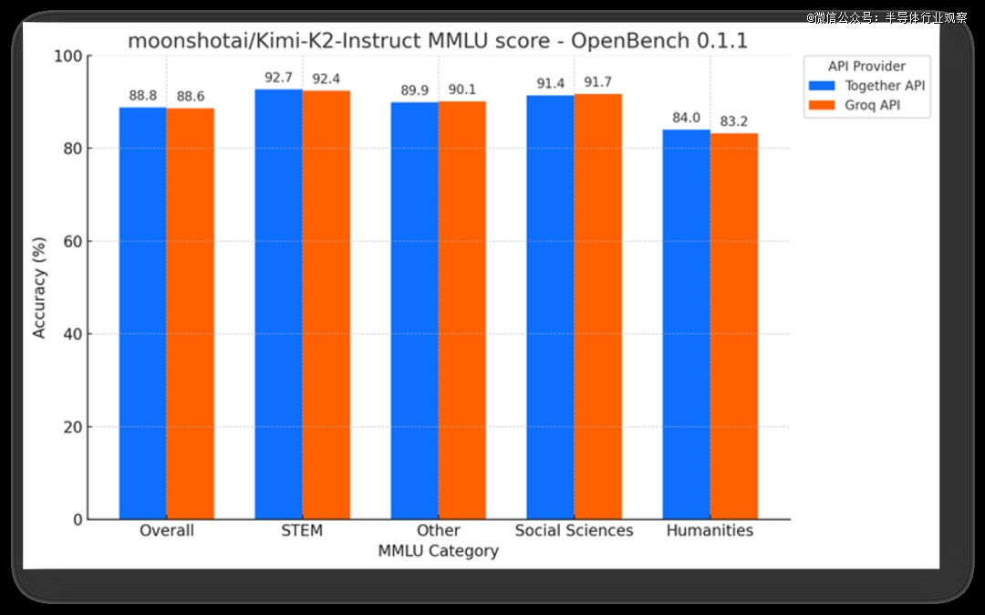 可靠性层面,根据开放式大模型评估框架OpenBench数据显示,Groq与基于英伟达GPU 的 API 提供商上Together AI 运行Kimi-K2-Instruct 模型的MMLU实例,结果表明,Groq的准确率更高,在STEM、Social Sciences等方面都比肩GPU AI Infra能力。