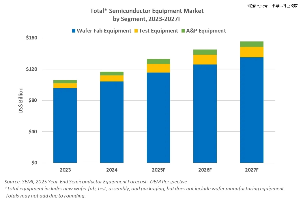 与此同时,设备支出也在暗示,行业正在为AI做“长期押注”。SEMI 在 2025 年 12 月的预测中称,全球半导体设备销售额预计 2025 年约 1330 亿美元,并预计 2026 年 1450 亿、2027 年 1560 亿美元;同时,后道设备(测试、封装装配)也被明确点名为增长动力。这类“连续多年增长”的资本开支曲线,往往意味着两件事:1)行业相信 AI 需求不是一两个季度的脉冲,而是多年期的基础设施建设;2)但也意味着供给扩张在路上——一旦需求增速低于供给增速,价格周期会反向放大波动。