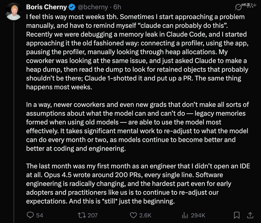 资深工程师 Boris Cherny 称,「我每周都有这种感觉,有时候开始手动处理一个问题,然后得提醒自己:Claude 应该能搞定这个。」