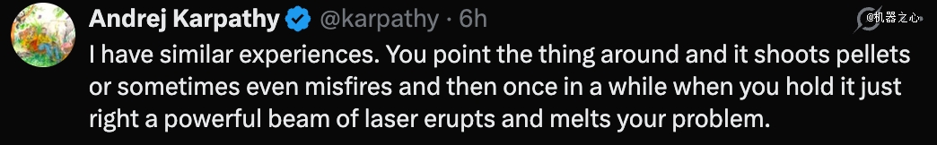 Karpathy 打了个比方来解释这种感觉,就像你拿着 AI 四处瞄准,它会发射弹丸,有时甚至会哑火,但偶尔当你握住它的角度恰到好处时,一道强大的激光束会突然爆发,瞬间帮你解决问题。