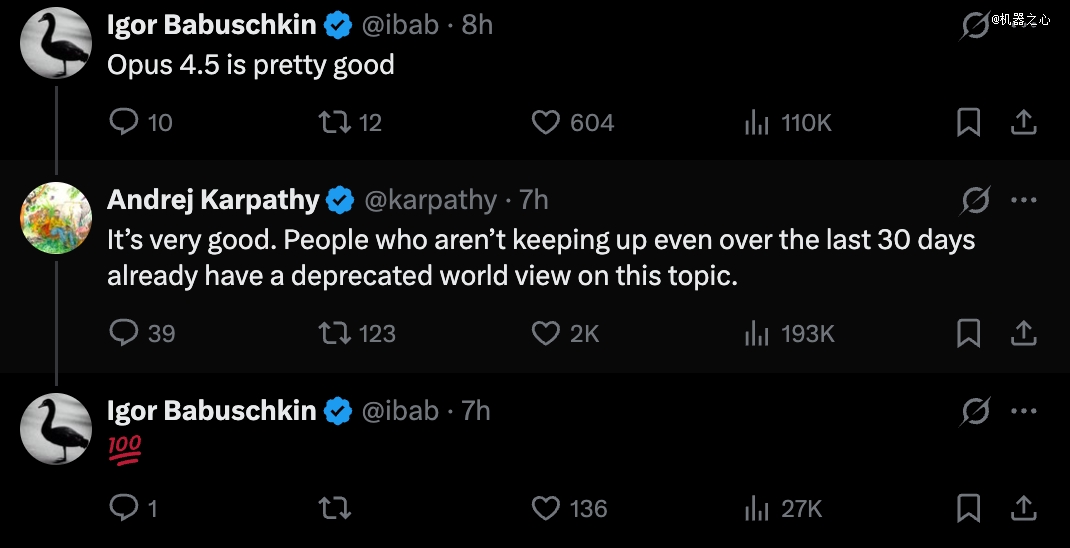 X 联合创始人 Igor Babuschkin 在评论区点名表扬竞争对手 Claude Opus 4.5 表现出色,Karpathy 回应道,AI 进化太快了,过去 30 天没跟上的人,观点就已经过时了。