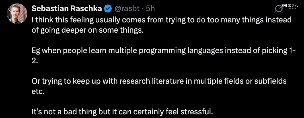 《Build a Large Language Model From Scratch》也挺看得开,大家现在普遍焦虑技能「落后」问题,通常来自于试图同时做太多事情,而不是在某些事情上深入钻研。比如,有些人学好几门编程语言,而不是专精 1-2 门。或者试图同时跟进多个领域 / 子领域的研究文献…… 这本身不是坏事,但确实会让人感到压力很大。