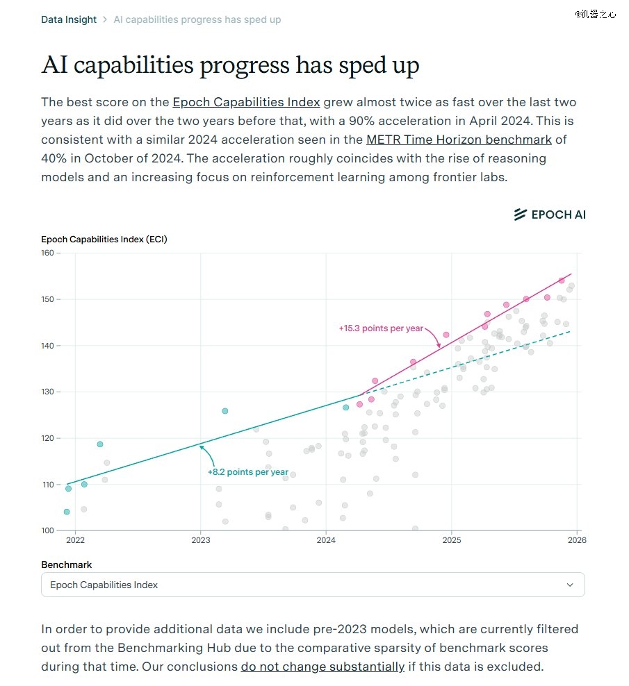 据 Epoch AI 的数据显示,Epoch Capabilities Index (ECI,一个衡量 AI 通用能力的综合指标) 在过去两年增长速度几乎是前两年的两倍,2024 年 4 月更是加速增长了 90%。