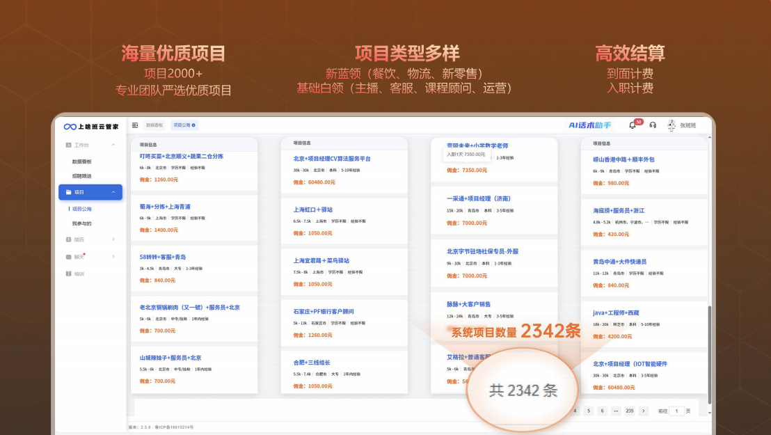 上啥班提供的不只是项目,更是“系统+资源+陪跑”的全套支持:自主研发的智能招聘SaaS系统、沉淀多年的真实项目库、从0到1的全程运营扶持。