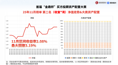 但“金鼎杯”买方投顾资产配置大赛11月榜单的实战案例,却给出了另一种可能:11月榜冠军“黄***”(参赛组合名)逆市斩获3.06%收益,*回撤仅4.02%;亚军“收复*湾”(参赛组合名)以2.08%收益、3.19%*回撤稳坐第二。更值得关注的是,两位参赛者均为榜单“老面孔”——“黄***”曾获10月亚军、9月及4月季军,“收复*湾”是10月冠军,业绩延续性凸显专业实力,也证明“垃圾时间”不是躺平期,而是买方投顾资产配置价值的“试金石”。