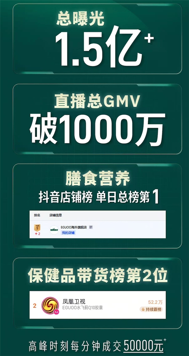 在内容与人气的共同拉动下,多项核心数据持续刷新纪录。活动期间,EGUOO旗下抖音店铺“EGUOO海外旗舰店”登顶抖音膳食营养类目单日总榜第1,凤凰卫视账号同步跻身保健品带货榜第2位。其中,核心产品水飞蓟Q10胶囊表现尤为亮眼,凭借口碑发酵与用户复购双轮驱动,单场销售额突破350万元,成为直播间当之无愧的“明星单品”。