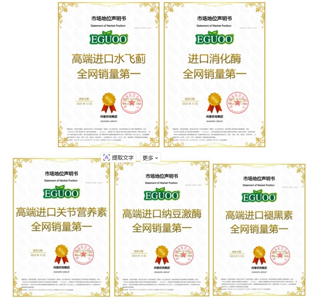 EGUOO在本次凤凰卫视的热销并非偶然。不久前,EGUOO还获得尚普咨询认证的“高端进口水飞蓟全网*”“进口消化酶全网*”“高端进口关节营养素全网*”“高端进口纳豆激酶全网*”“高端进口褪黑素全网*”等多项权威市场认证,进一步夯实了其在精准营养赛道中的*地位。