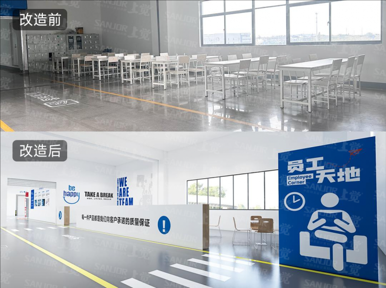 改造前,休息区仅是几张旧桌椅;改造后,“员工天地”成为温馨角落:人体工学座椅、绿植点缀、文化灯箱(员工风采+励志语录)……这里不仅是休息场所,更是“企业尊重人、员工热爱企”的文化触点。员工坦言:“现在休息时看着墙上的伙伴故事,干活更有劲儿了!”