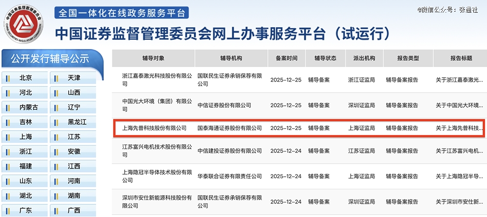 在业绩稳健增长与核心技术持续突破的双重支撑下,先普科技资本化进程全面提速。12月 25日,证监会官网公示信息显示,上海半导体气体纯化龙头先普科技已在上海证监局完成上市辅导备案登记,正式启动A股IPO进程,资本化之路迈出关键一步。