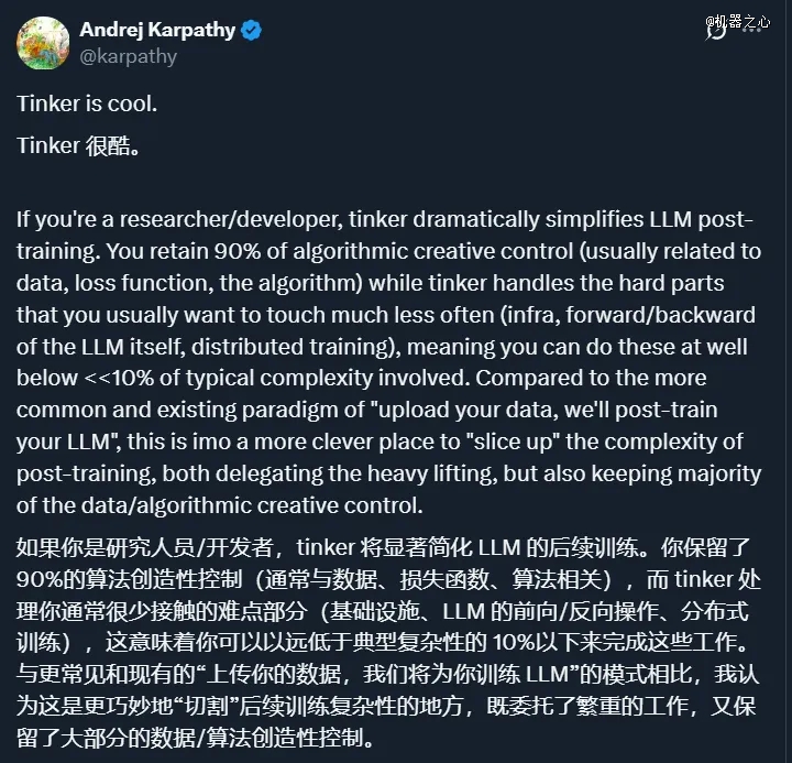 为了解决这个问题,前 OpenAI CTO Mira 创立的 Thinking Machines 发布了 Tinker,定义了后训练 API 的新范式,迅速获得美国学界和硅谷创业公司的热捧。