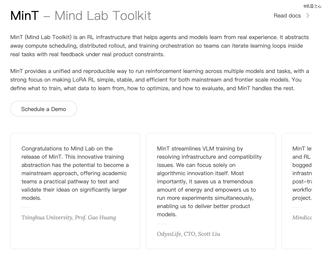 Tinker 在海外大火的同时,国内也涌现出了对标甚至超越的力量 ——Mind Lab 推出的 MinT(Mind Lab Toolkit)。
