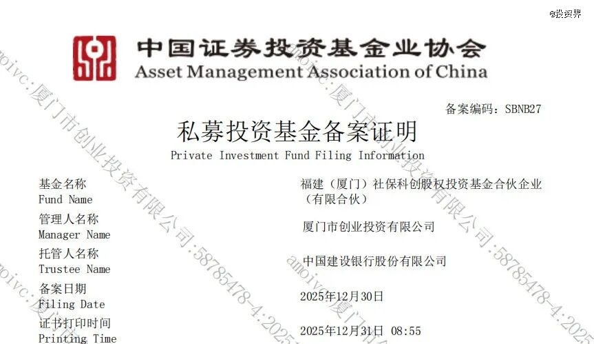 投资界(ID:pedaily2012)消息,12月31日,由福建省、厦门市、全国社会保障基金理事会、中国建设银行共同发起设立的福建(厦门)社保科创股权投资基金合伙企业(有限合伙)顺利通过中国证券投资基金业协会备案,标志着全国社会保障基金理事会与福建省、厦门市的战略合作正式落地。