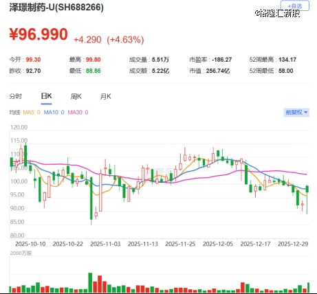 泽璟制药已于2020年1月登陆科创板,证券代码:688266.SH,截至1月5日收盘,公司股价为96.99元/股,市值为256.7亿元。