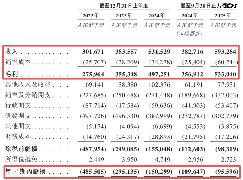 2022年、2023年、2024年、2025年1-9月(报告期),公司的收入分别为3.2亿元、3.84亿元、5.32亿元、5.93亿元,毛利率分别为91.5%、92.6%、93.6%、89.8%。