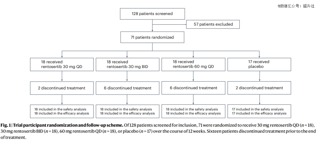 基于Rentosertib的IIa期设计来看,试验分成四组,患者分别服用30mg每日一次、30mg每日两次、60mg每日一次以及接受安慰剂治疗,接受Rentosertib治疗三组患者人数为18人,接受安慰剂治疗组为17人。