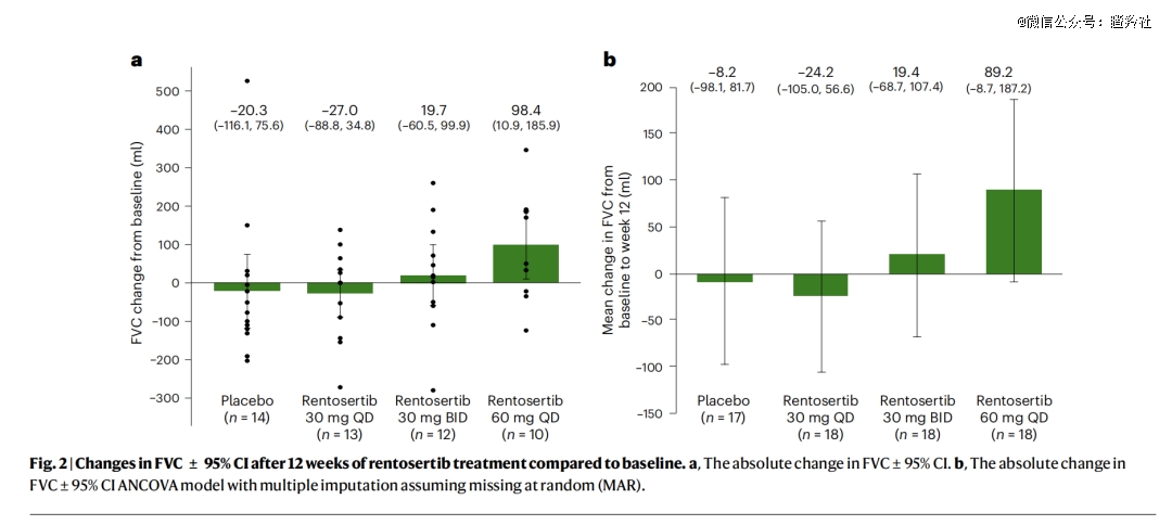 更加值得注意的是疗效数据,高剂量的Rentosertib能够使得IPF肺部功能有明确改善,这里我们采用《自然·医学》中更详细的图表和数据。