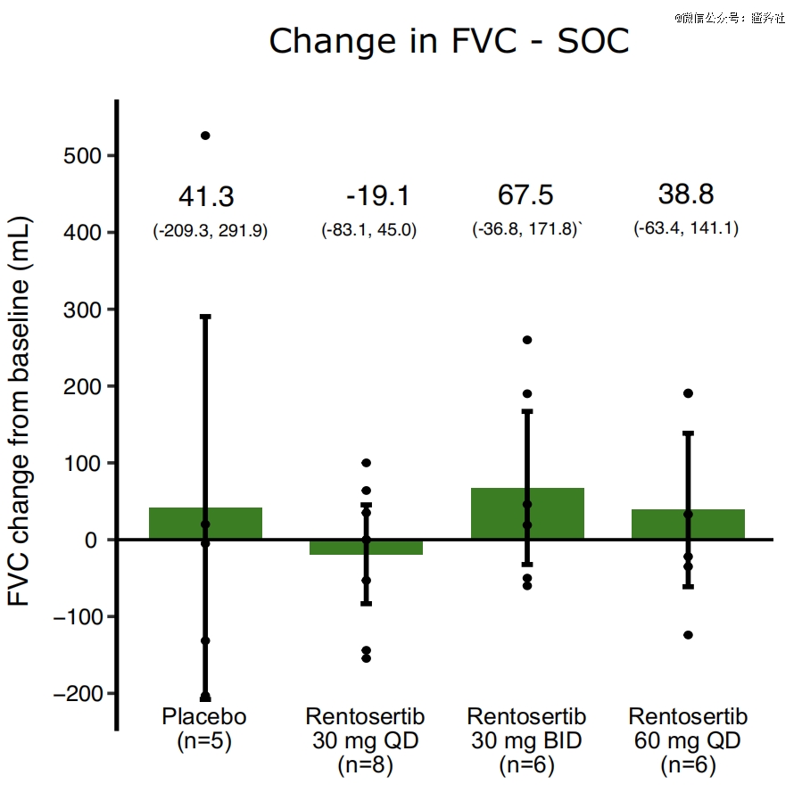 更值得注意的是,在那些没有使用标准疗法的IPF患者亚组的分析中,每天一次60mg的Rentosertib组FVC更是增加了187.8毫升。
