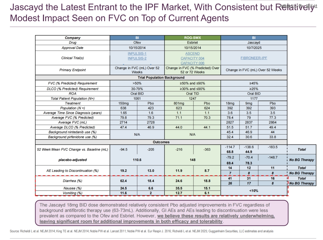 另外安全性上,Jascayd胃肠道不良反应(腹泻、恶心、呕吐)较尼达尼布有较大改善,安全耐受性更好,无临床显性肝损伤或肝酶显著升高的信号。