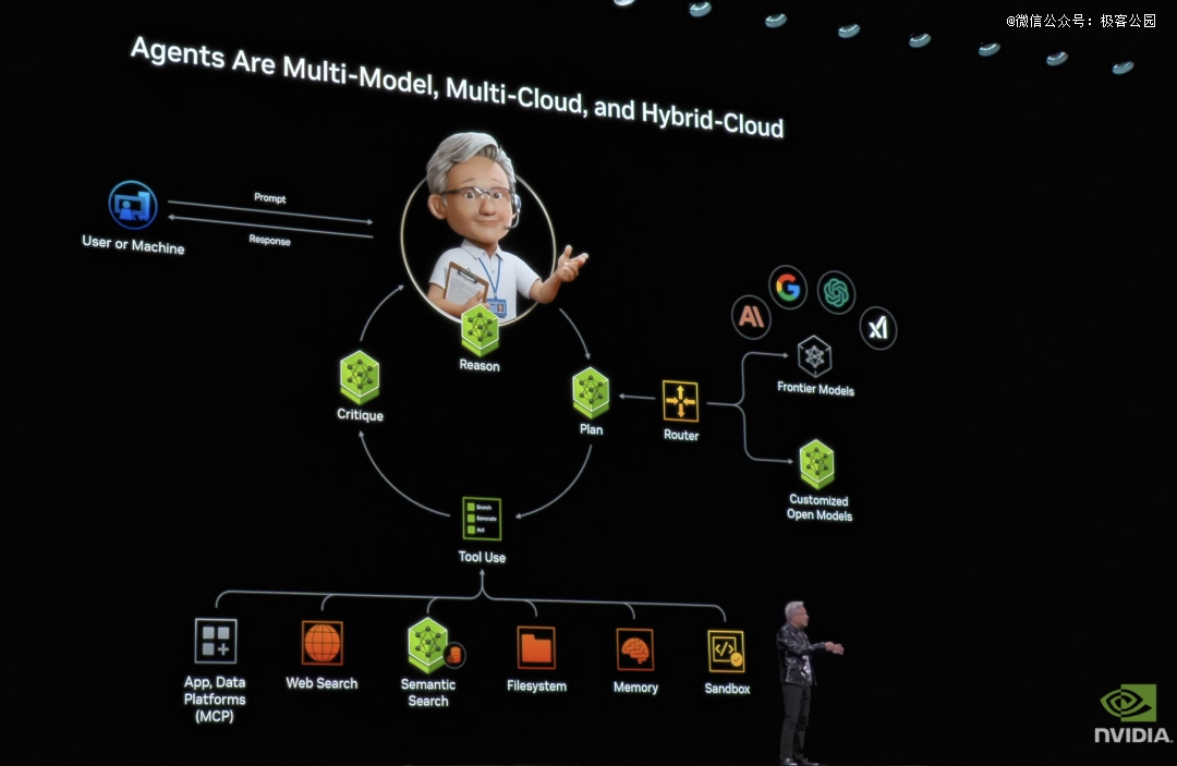 黄仁勋认为,未来的 AI 不只是多模态,而是「多模型」。最聪明的系统,应该在不同任务中调用最合适的模型,最真实的系统,天然是多云、混合云、边缘计算的。