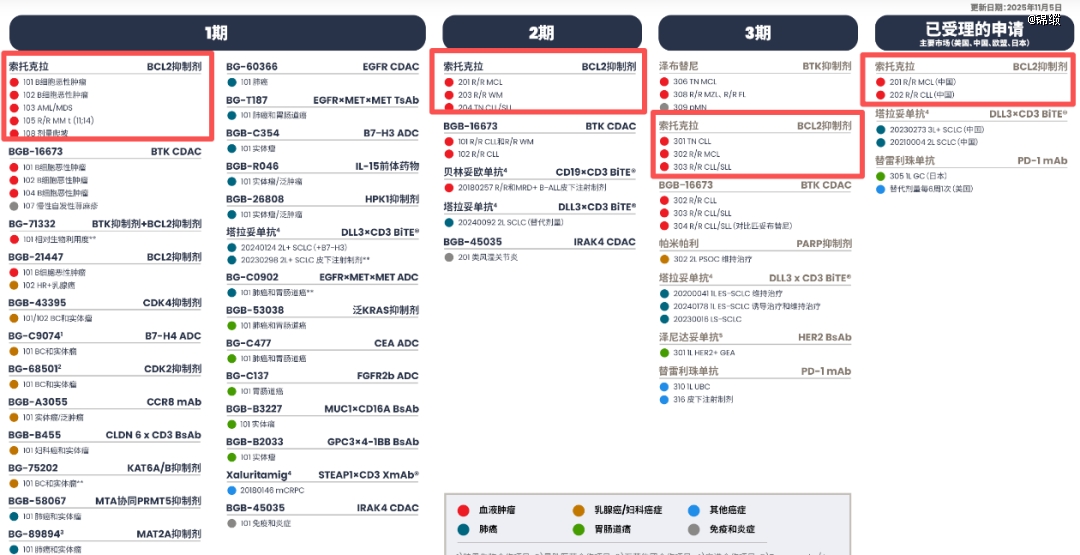 1月5日,中国国家药品监督管理局(NMPA)官网公示核心信息:百济神州自研BCL-2抑制剂索托克拉(BGB-11417)一次性获批两项关键适应症,分别为:治疗既往接受过治疗的慢性淋巴细胞白血病(CLL)/小淋巴细胞淋巴瘤(SLL)成人患者;治疗既往接受过抗CD20治疗与布鲁顿氏酪氨酸激酶抑制剂(BTKi)双重治疗的套细胞淋巴瘤(MCL)成人患者。